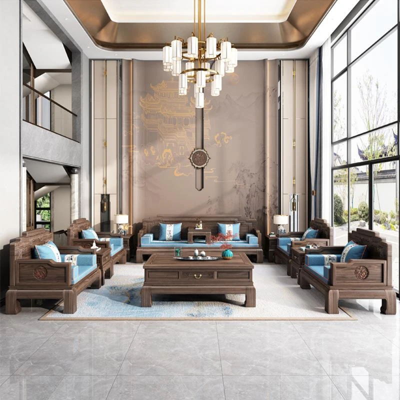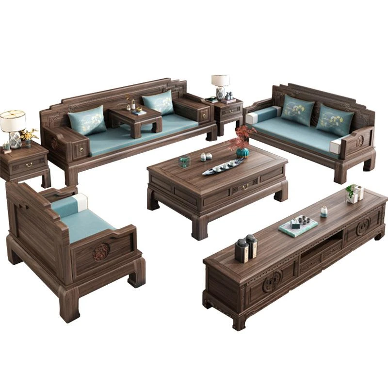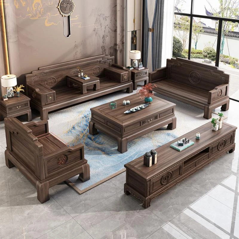 南米産のブラックウォールナットを使用した新中式全木製ソファセット - 冬も夏も快適!軽やかなラグジュアリー感と古典的なデザインが融合した、上質なリビング空間を演出します。