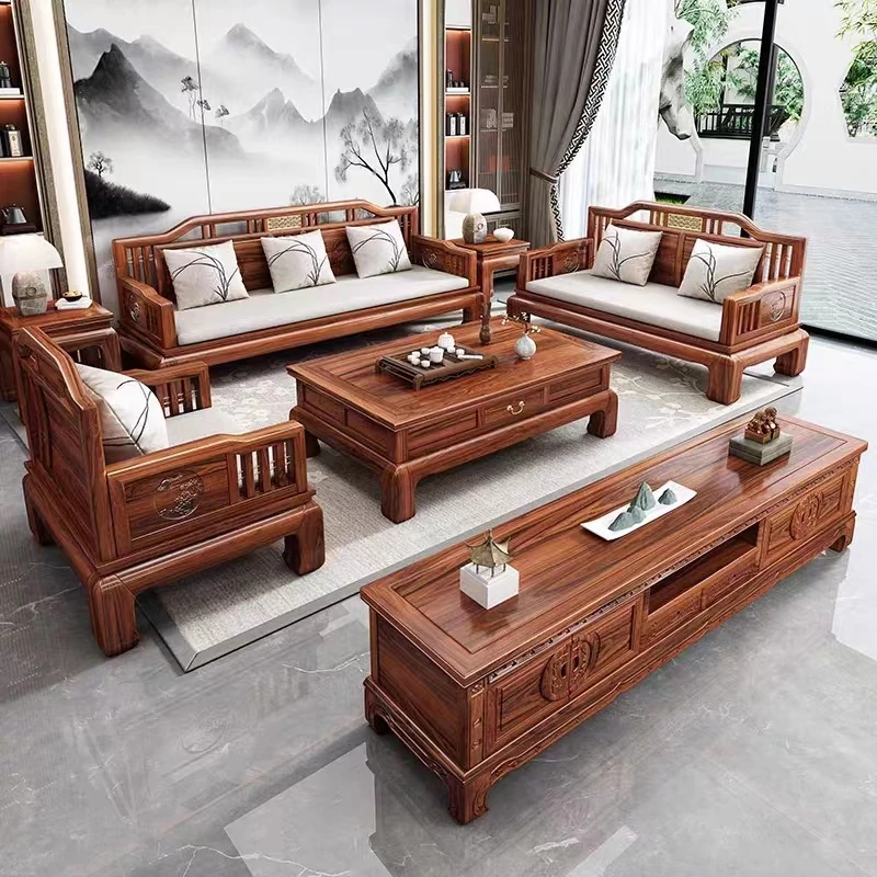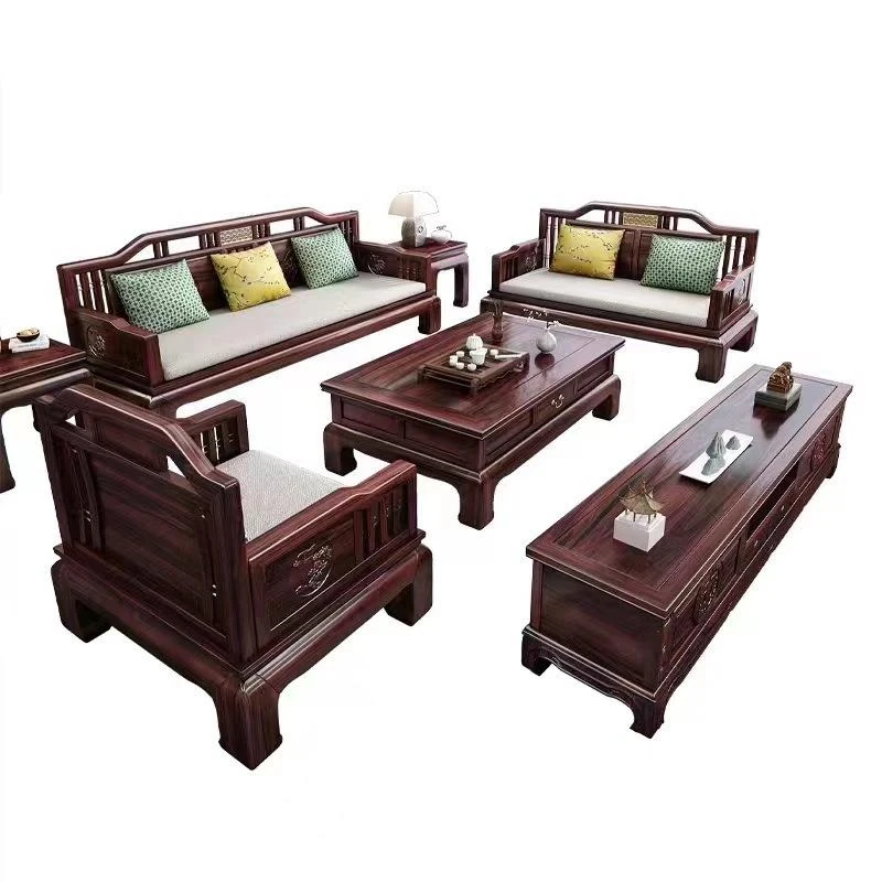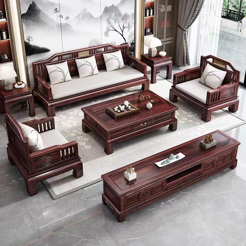 新中式ウッドブラック全実木ソファー リビングルーム用コンビネーション 大小問わず適応 アンティーク風の紅木デザイン 冬夏に最適な別荘スタイル