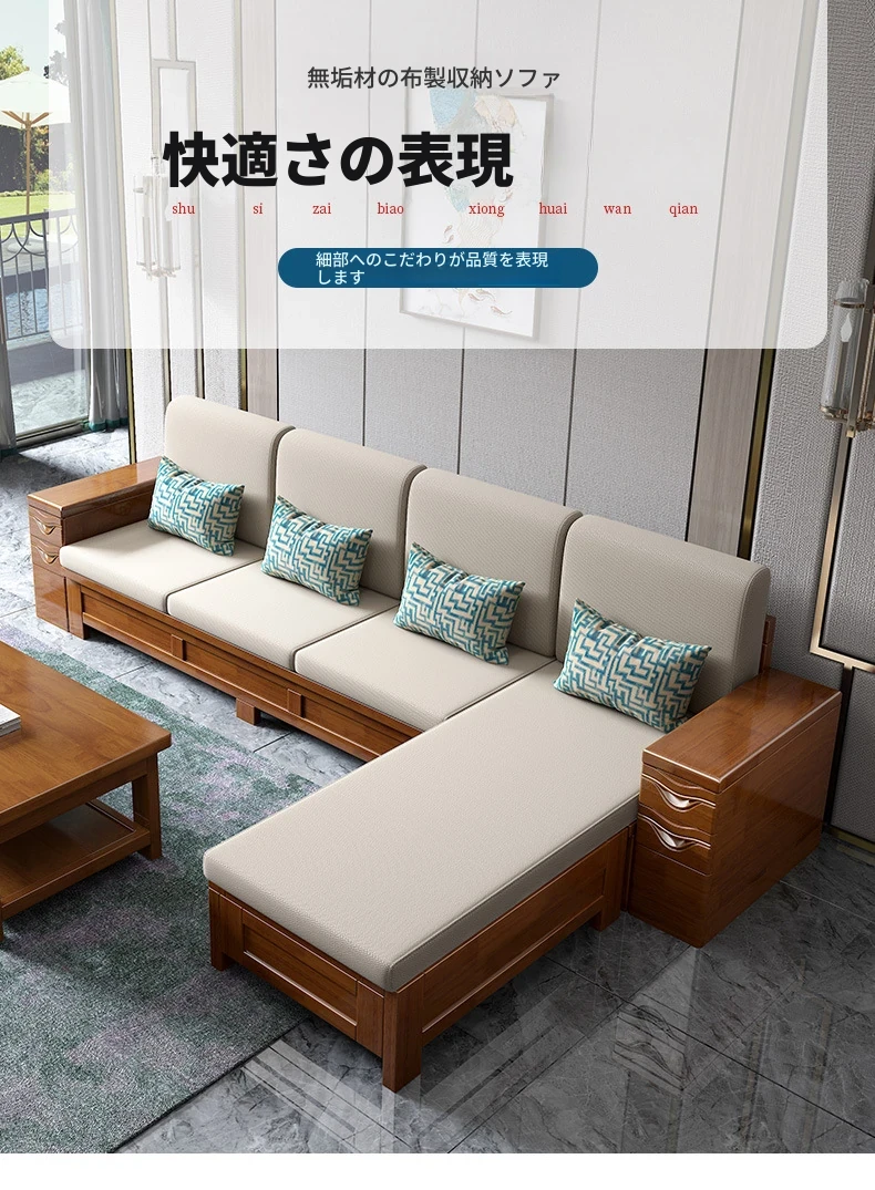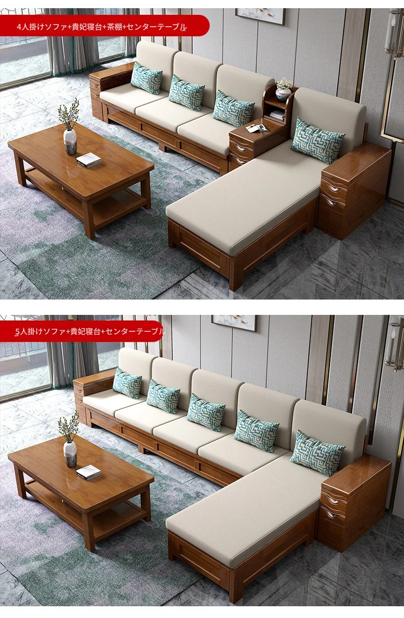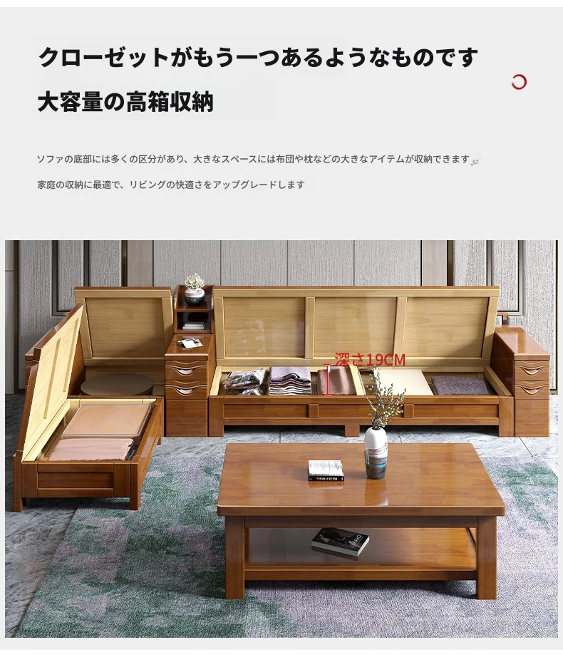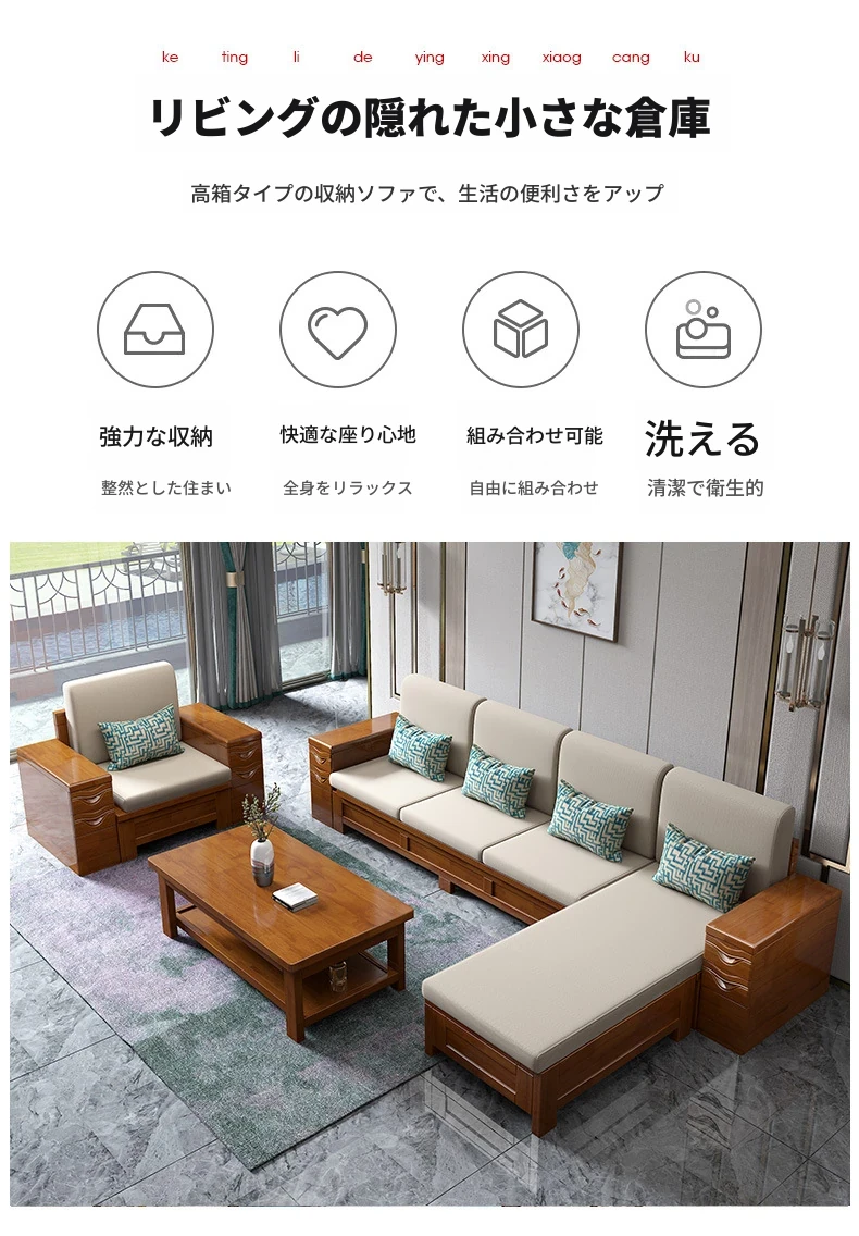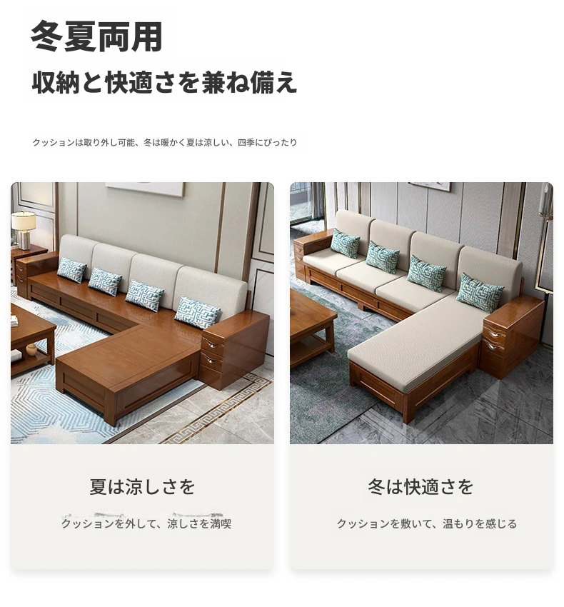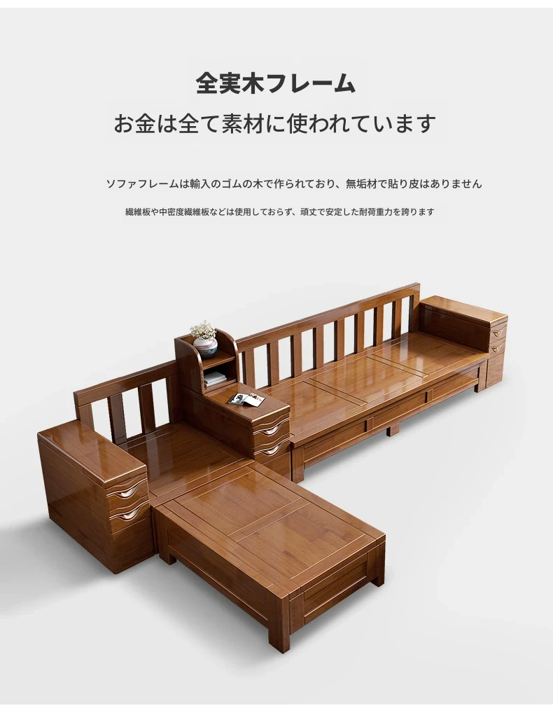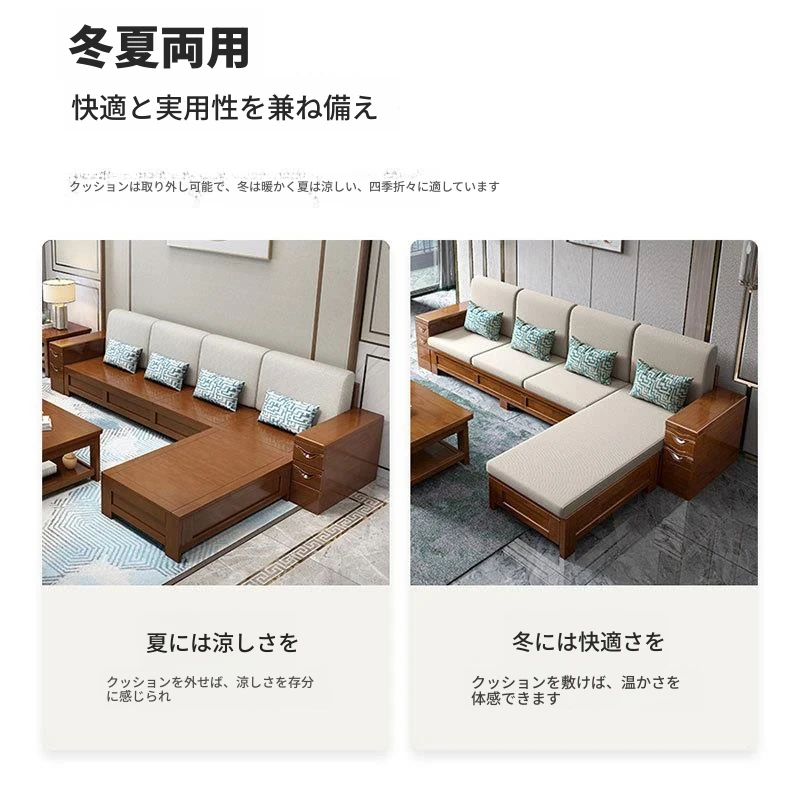 冬夏兼用!実木ソファーセット - 小型住宅に最適な新中式現代デザイン、収納力抜群の高箱付き木製家具で、快適なリビング空間を実現!