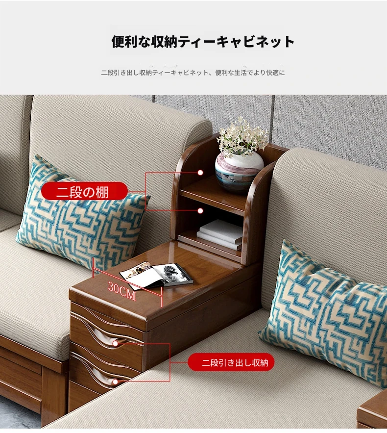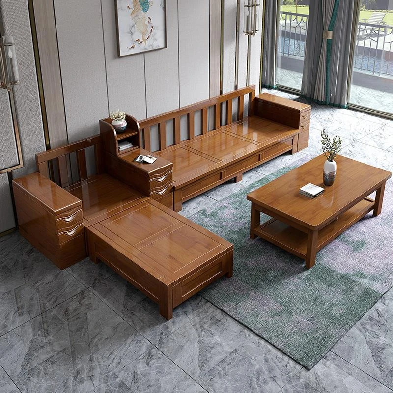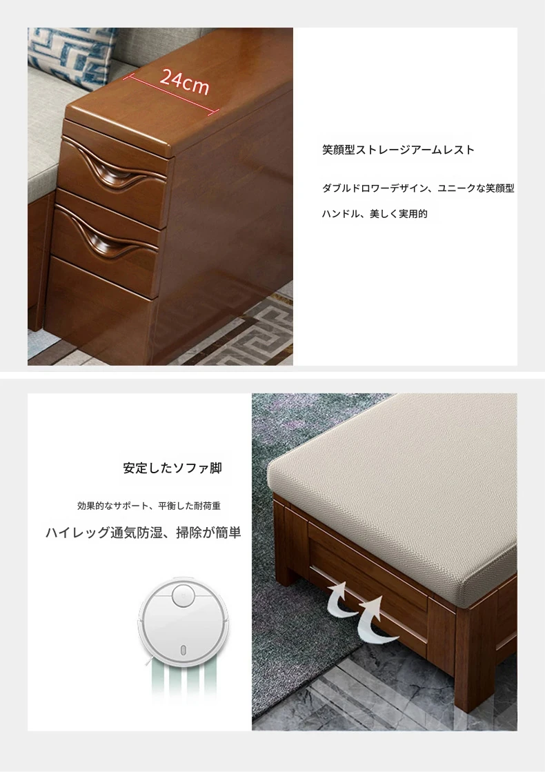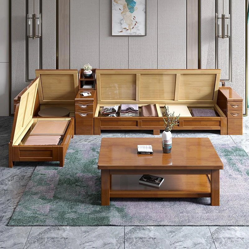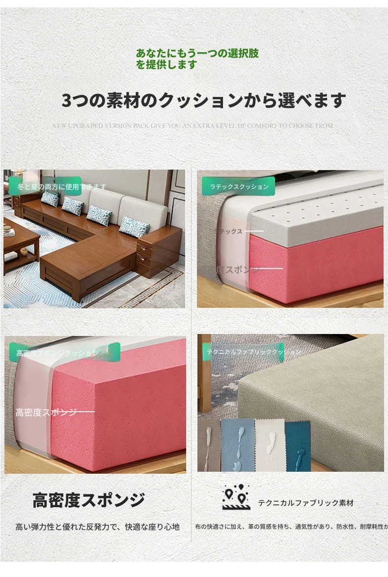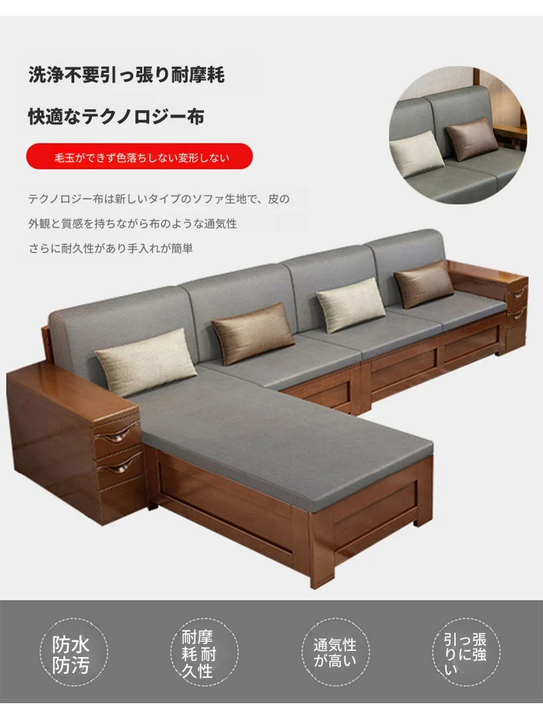 冬夏兼用!実木ソファーセット - 小型住宅に最適な新中式現代デザイン、収納力抜群の高箱付き木製家具で、快適なリビング空間を実現!