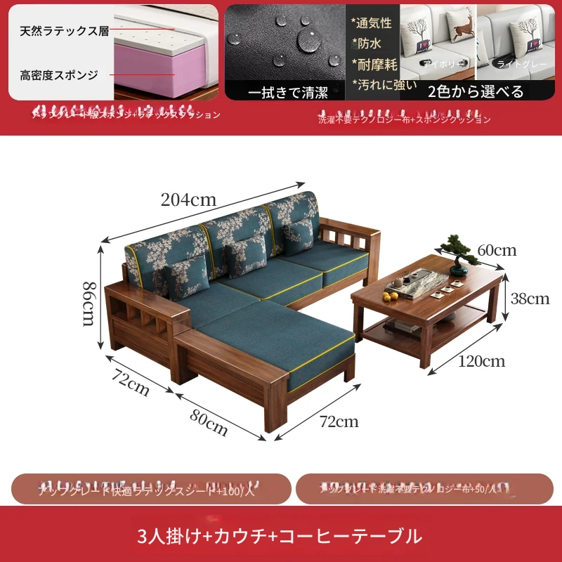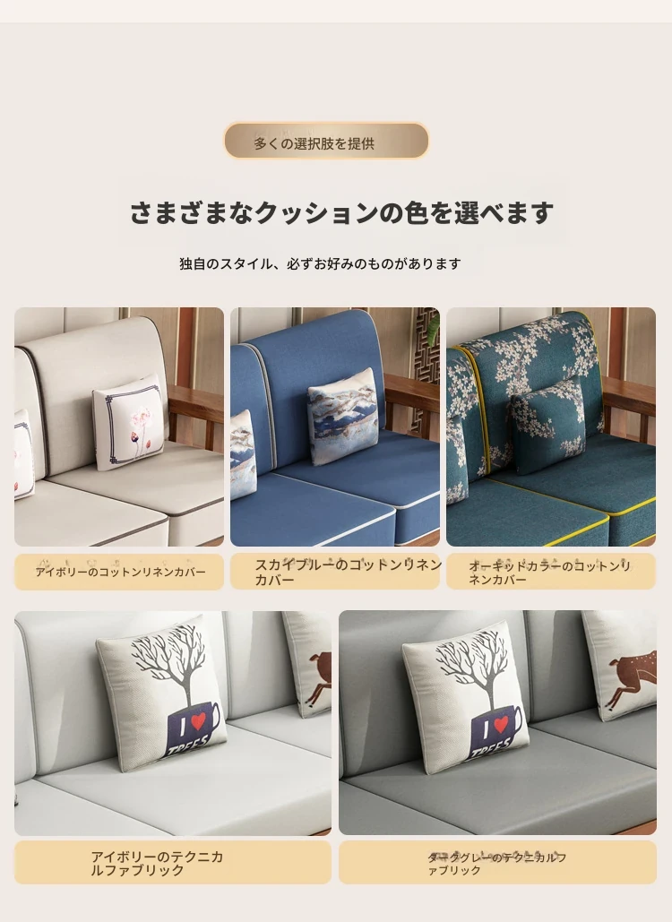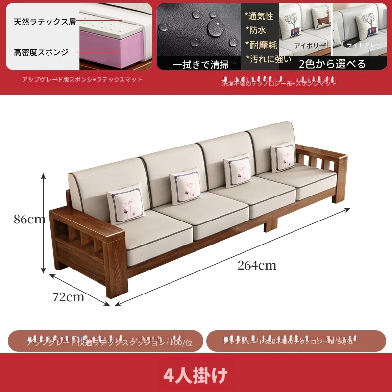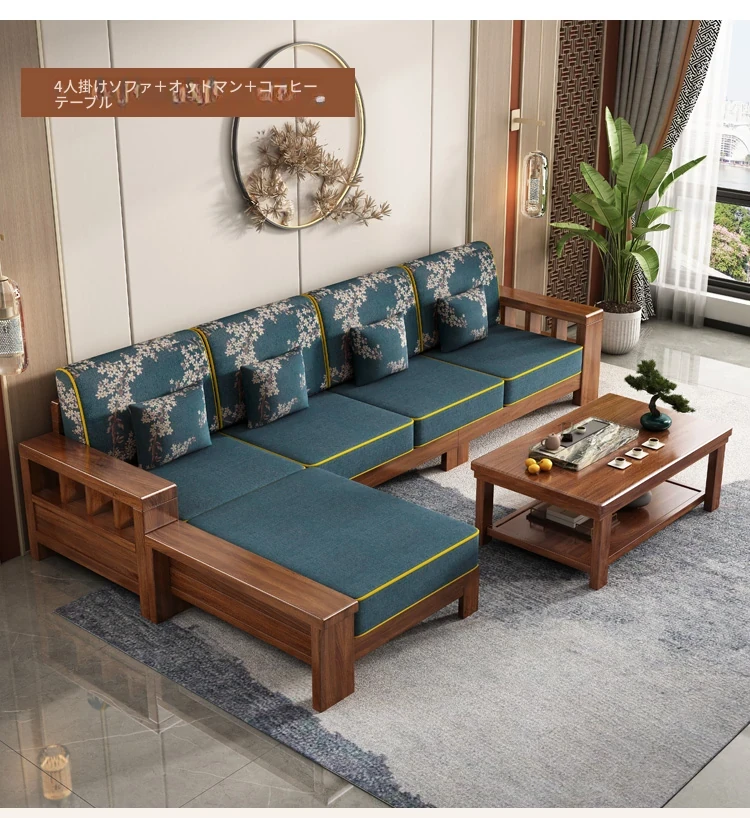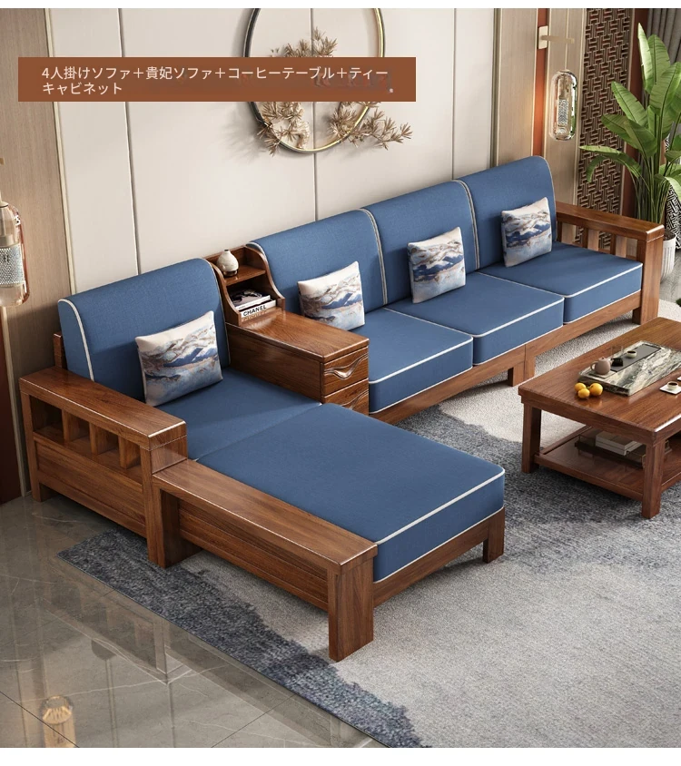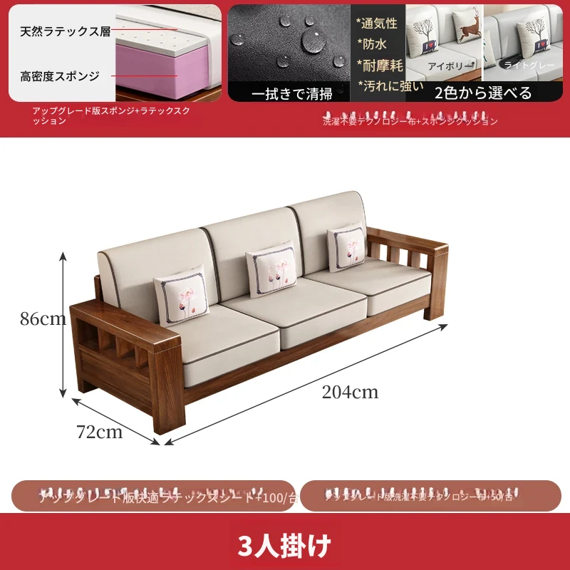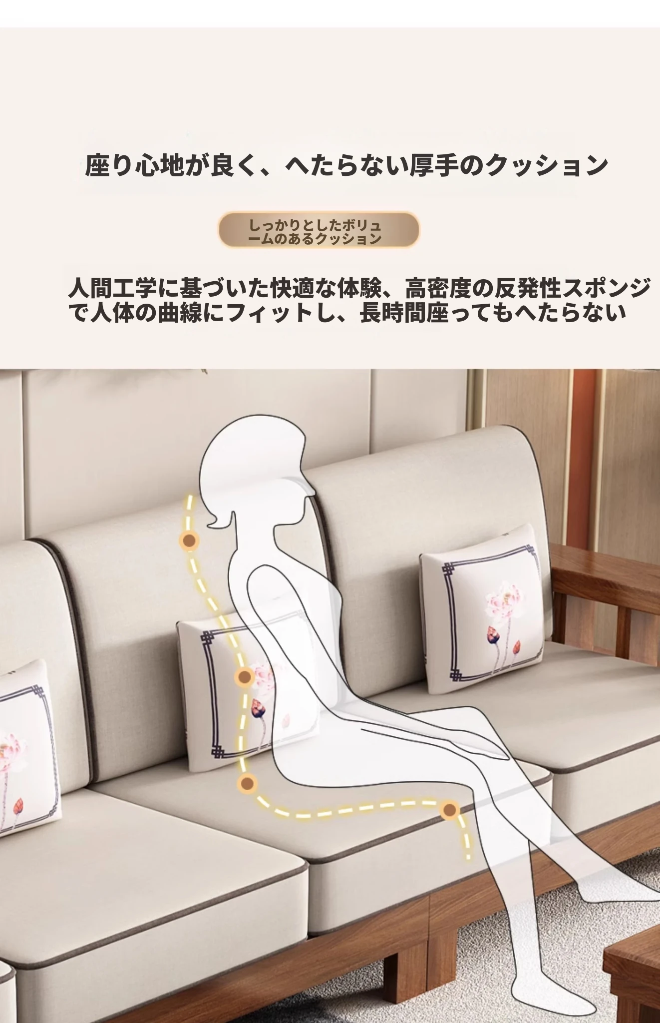 胡桃無垢材ソファセットY908|中華風シンプルモダンリビングにぴったり!3人掛け木製ファブリックソファ、小型アパートにも最適なスタイリッシュなデザイン!
